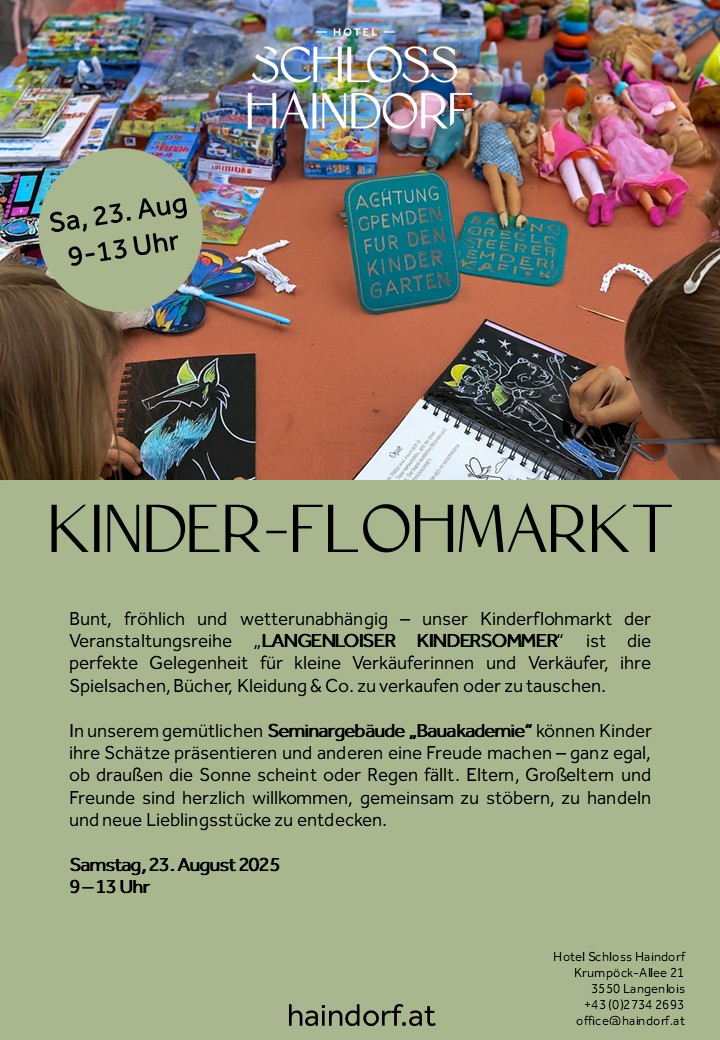 Bunt, fröhlich und wetterunabhängig – unser Kinderflohmarkt der Veranstaltungsreihe „Langenloiser Kindersommer“ ist die perfekte Gelegenheit für kleine Verkäuferinnen und Verkäufer, ihre Spielsachen, Bücher, Kleidung & Co. zu verkaufen oder zu tauschen.