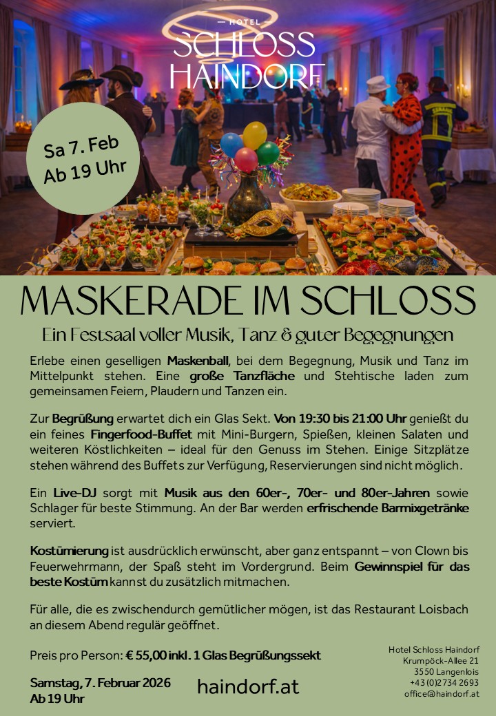 RESERVIERUNG NOTWENDIG: Online unter https://haindorf.at/kulinarik/#reservieren, per Mail an office@haindorf.at oder telefonisch unter +43 2734 2693!