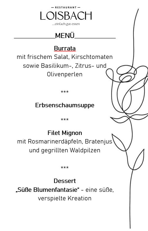 inkl. 1 Glas Sekt als Empfang, 4-Gänge-Menü sowie passender Weinbegleitung (Wein wird nachgeschenkt), alle anderen Getränke sind selbst zu bezahlen.