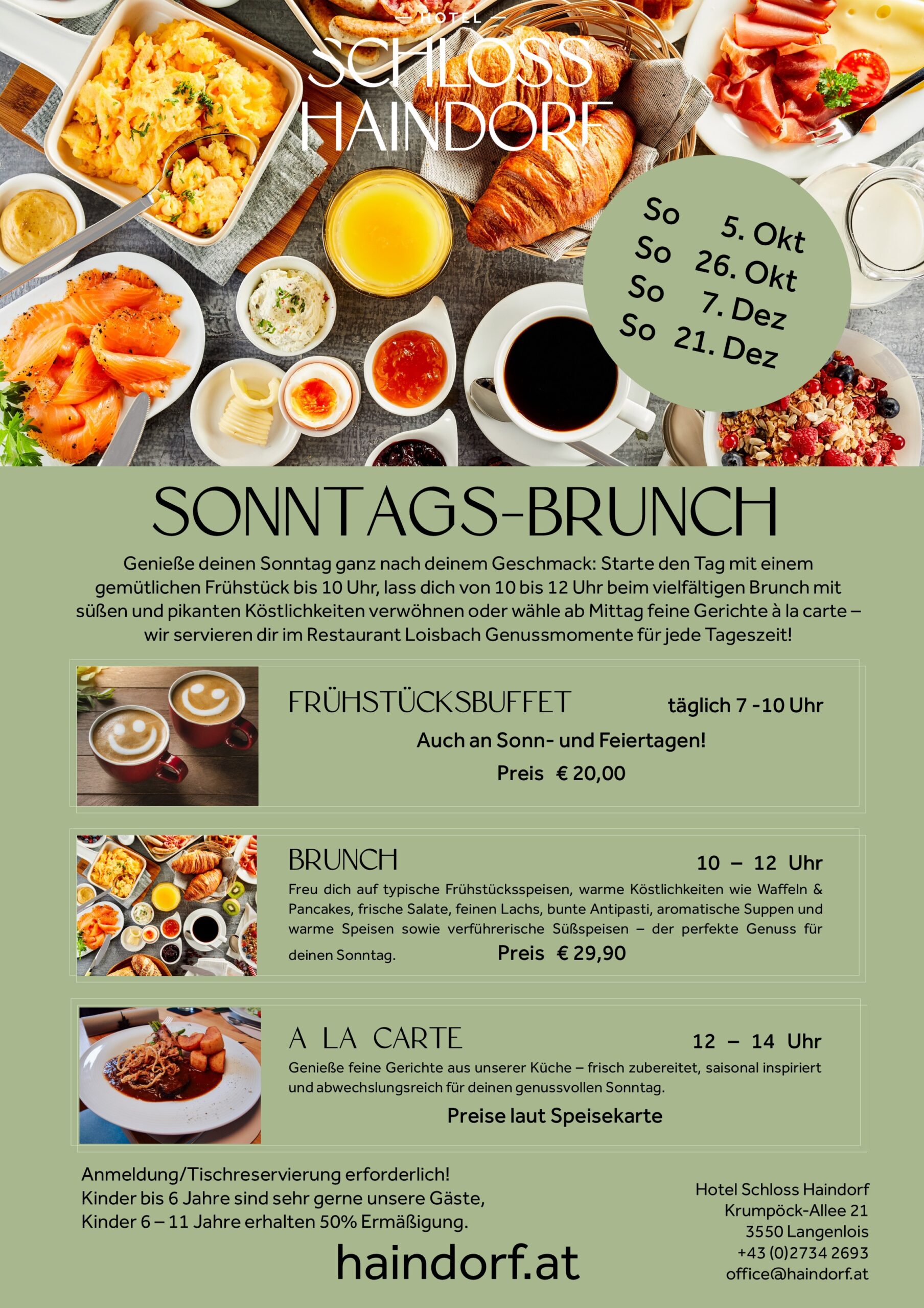 Genieße deinen Sonntag ganz nach deinem Geschmack: Starte den Tag mit einem gemütlichen Frühstück bis 10 Uhr, lass dich von 10 bis 12 Uhr beim vielfältigen Brunch mit süßen und pikanten Köstlichkeiten verwöhnen oder wähle ab Mittag feine Gerichte à la carte – wir servieren dir im Restaurant Loisbach Genussmomente für jede Tageszeit!