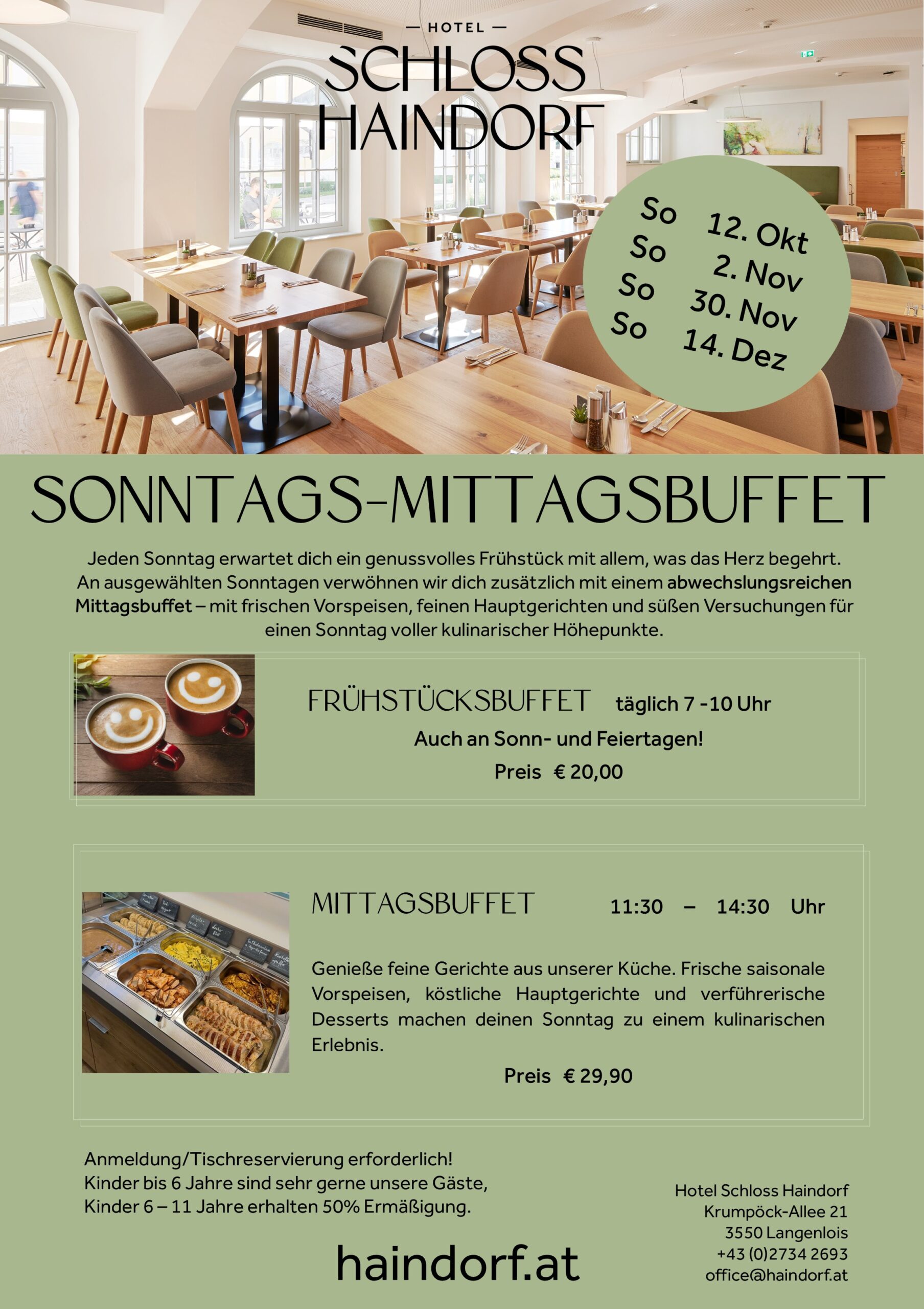 An ausgewählten Sonntagen verwöhnen wir dich zusätzlich mit einem abwechslungsreichen Mittagsbuffet – mit frischen Vorspeisen, feinen Hauptgerichten und süßen Versuchungen für einen Sonntag voller kulinarischer Höhepunkte.